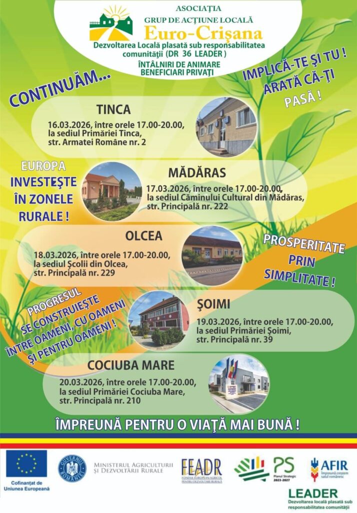 Întâlnirile se vor desfășura în localitățile bihorene Tinca, Mădăras, Olcea, Șoimi și Cociuba Mare, între orele 17:00 – 20:00, conform programului detaliat în afișul anexat.